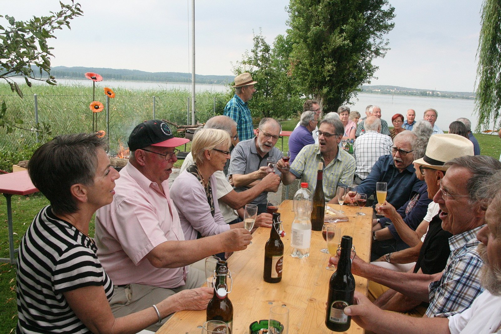Begrüsst wurden die Gäste mit einem Glas Sekt und einer Käseplatte. Am warmen Sommerabend konnte man am Wasser den Blick von der Reichenau bis nach Konstanz schweifen lassen und die Ruhe geniessen. Langsam wurden zwei grosse Holzgrills angefeuert, um später eine gleichmässige Hitze zu bekommen.